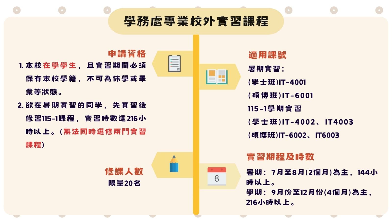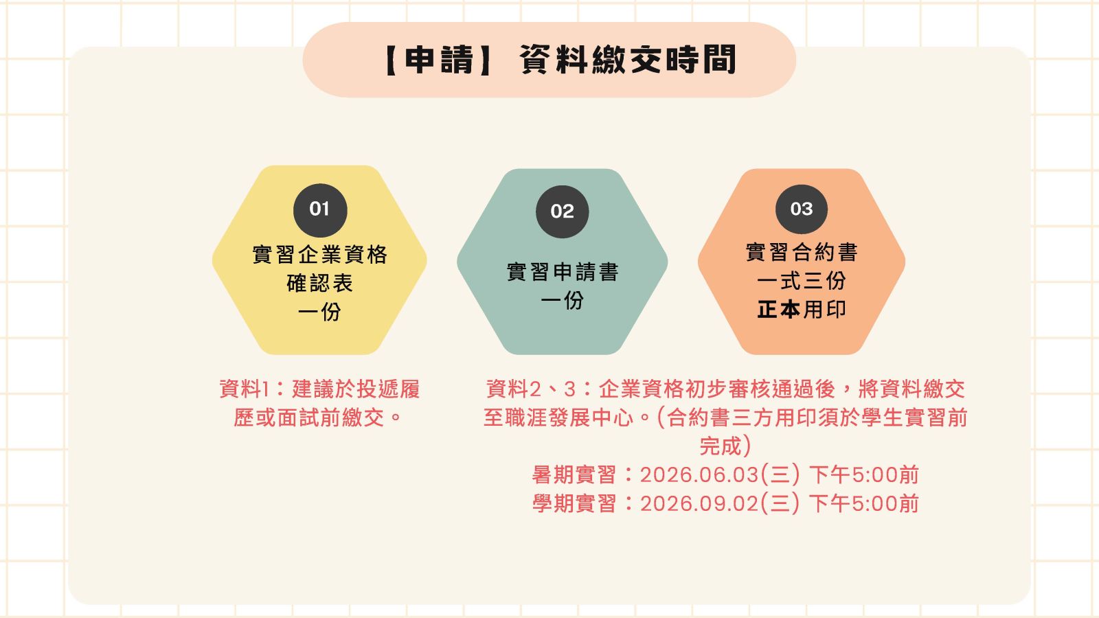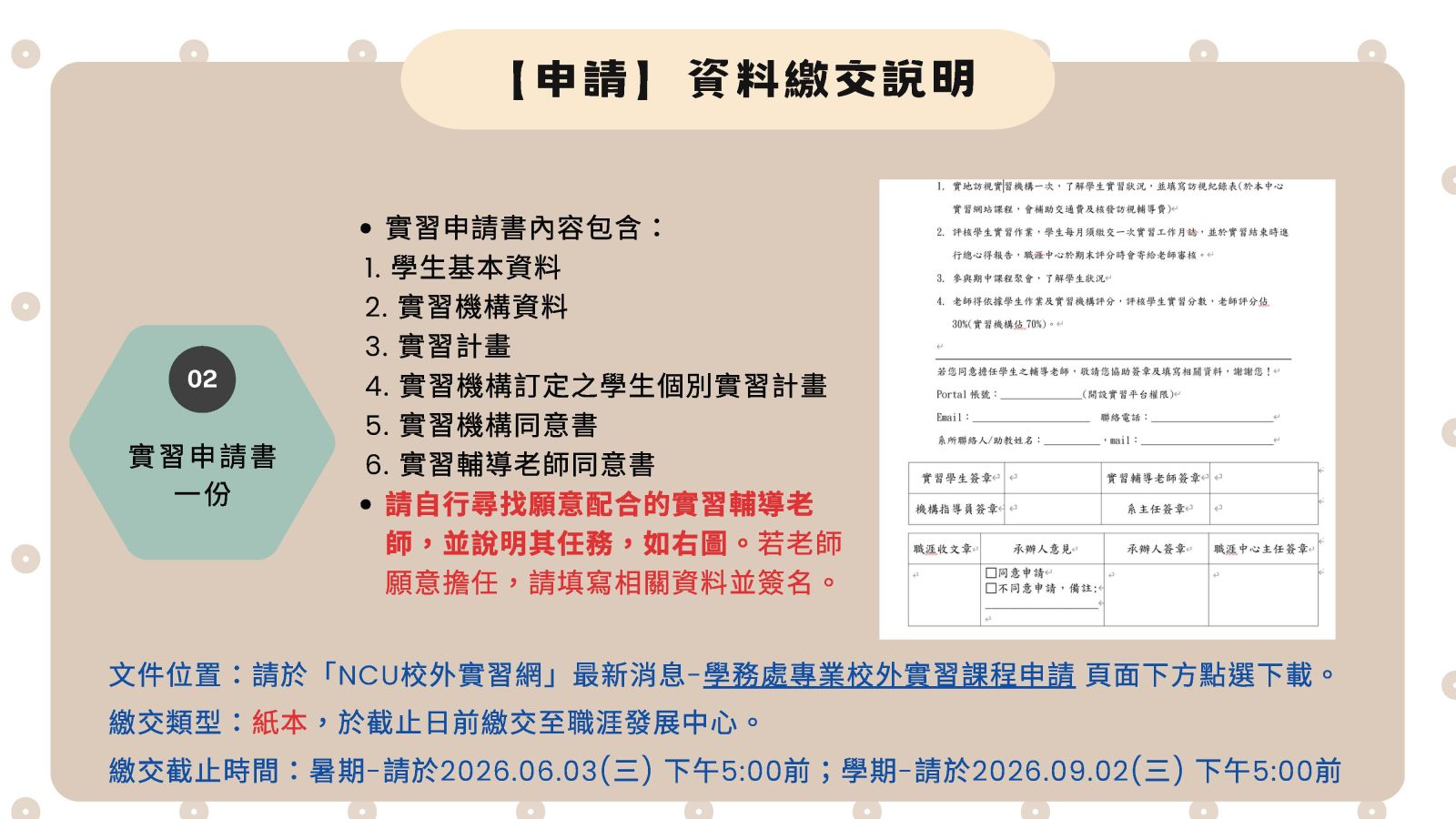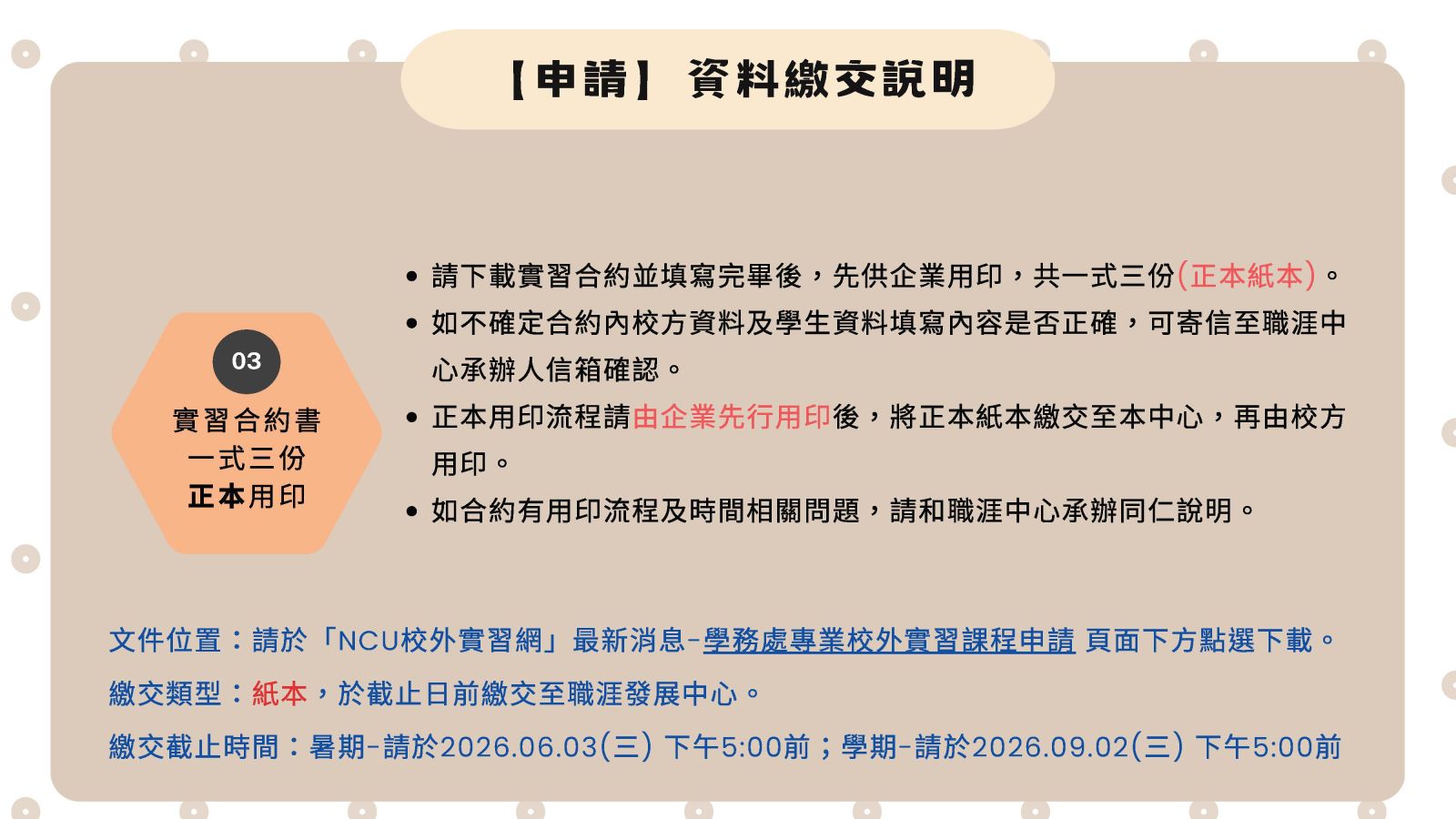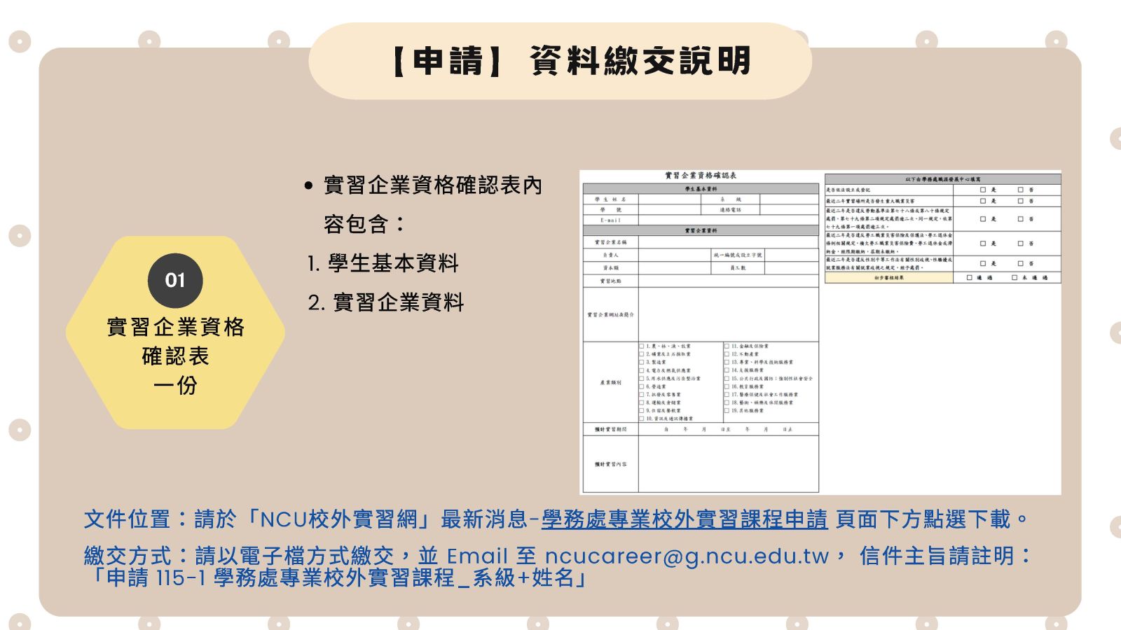 附件檔案:國立中央大學學務處_實習企業資格確認表.doc國立中央大學學務處_學生校外實習申請書_2026.02.12.docx國立中央大學學務處_學生國內實習合約書.docx